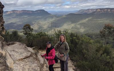 On a 2021 hike, Tracey Wyatt (right) shows Australia’s Blue Mountains to Nancy Fleming, a longtime U.S. Rotarian before her death.