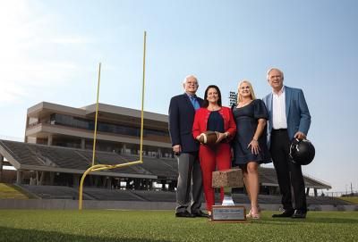From left: A cancer survivor, Dr. Bucky Ribbeck (right) knows how powerfully visits from the athletes can affect the kids with cancer. Image credit: Nathan Lindstrom. ZoAnn Dreyer, one of Ribbeck’s doctors when he was battling cancer, has worked with hundreds of Front Line Kids since becoming involved with the Lombardi Award in 1988. Image credit: Nathan Lindstrom. Vicki Brentin, who chaired the 50th Lombardi Award, is a member of the Rotary Club of Houston, which created and has administered the award since its inception. Image credit: Matt Nager. In 2023, a triumphant Laiatu Latu hoists the Lombardi Award as he becomes the coveted trophy’s 50th recipient. Image credit: Genesis Photographers/Courtesy of Vicki Brentin.