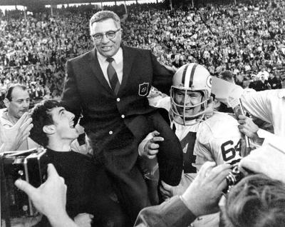 Members of the Green Bay Packers carry their coach, Vince Lombardi, off the field after winning their second Super Bowl in January 1968.