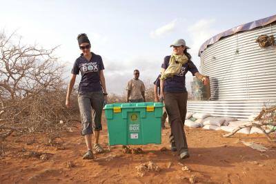 La caisse originale contient une tente pour dix personnes, dix sacs de couchages, une pelle pliante, des comprimés de purification de l’eau, des ustensiles de cuisine, un seau, une corde et une lampe de poche, mais, aujourd’hui, le contenu varie selon les besoins. Parfois, une tente familiale suffit. D’autres fois, des bâches ultra-résistantes avec des cordes et des piquets sont nécessaires pendant que des bâtiments sont réparés.