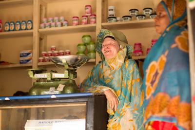 ロータリー会員のデオグラティス・イブンガ・ウェジナさん(右)は、ムソマ市で小口融資プロジェクトを運営しています。彼のプロジェクトは、美容室のオーナーのヘレン・ポールさんなど、アルビニズムの人々に役立っています。