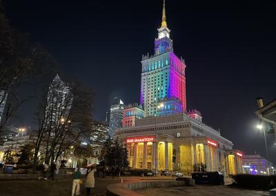 Als ich mich nach dem Rest von Warschaus Stadtzentrum umschaue, bleibt mein Blick am Kultur- und Wissenschaftspalast hängen. Das gewaltige Bauwerk ist fast 240 Meter hoch und das zweithöchste Gebäude in Polen. 1952 begonnen und im sowjetischen Stil errichtet, wurde das Hochhaus nach Stalins Tod fertiggestellt. Es erinnert an das Empire State Building und war ein „Geschenk“ Moskaus an den widerspenstigen Satellitenstaat. Nachts wird das Gebäude als Zeichen der Solidarität mit dem belagerten Nachbarn in den Nationalfarben der Ukraine – Gelb und Blau – angestrahlt. Das Symbol der kommunistischen Vergangenheit Polens überragt die nahe gelegenen Einkaufszentren, die mit Weihnachtsbeleuchtung und Leuchtreklamen westlicher Modemarken geschmückt sind.