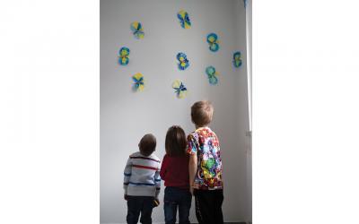 Das Hilfs- und Bildungszentrum für ukrainische Geflüchtete befindet sich in einem dreistöckigen Betongebäude in einer ruhigen Straße nahe des Stadtzentrums. Die Wände sind mit blauen und gelben Papierschmetterlingen verziert, die Schulkinder aus dem US-Bundesstaat New Hampshire für die ukrainischen Kinder gebastelt haben. Wir besuchen einen schlicht eingerichteten Raum, in dem zwei Mädchen und vier Jungen an einem großen Tisch sitzen und Augen und Nasen auf gelbe Papierhände malen. Anfangs sind sie noch etwas schüchtern, doch bald tauen sie auf und reden begeistert auf uns ein. Ich bekomme nur Wortfetzen mit und die Übersetzer haben Mühe, mit dem Wortschwall Schritt zu halten.