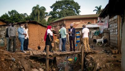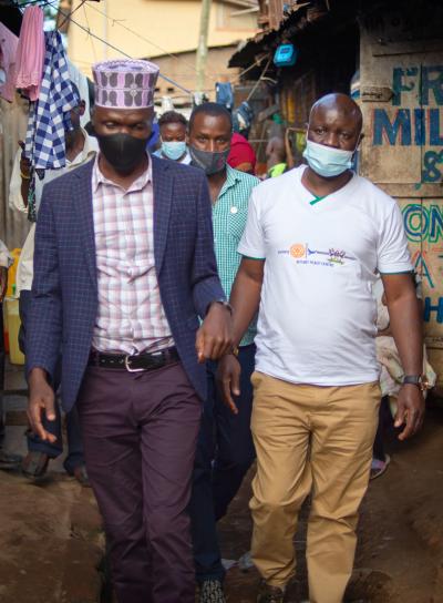 “We have done field work to appreciate the situation on the ground,” says Jew Moonde (right), walking with the peace fellows through a Kampala slum.