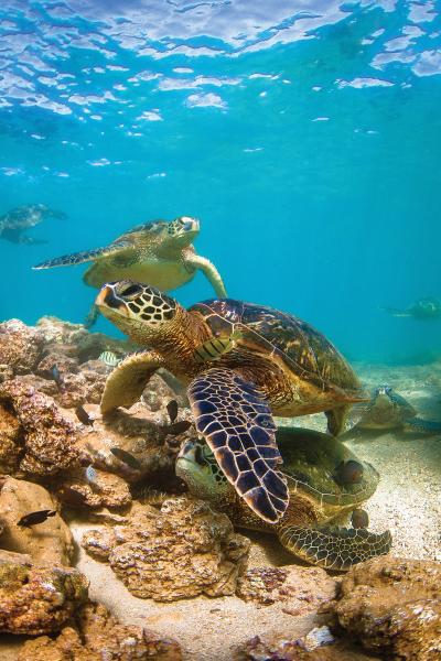 We’re on Laniakea Beach on Oahu’s North Shore, often called Turtle Beach for the green sea turtles that feed here. The turtles, called honu in Hawaiian, reach lengths of 3 to 4 feet and weigh in at 200 to 500 pounds. You can’t miss them at the Honolulu convention: They’re featured on the convention logo. (For more on Hawaii’s honu, see “Convention Countdown.”)