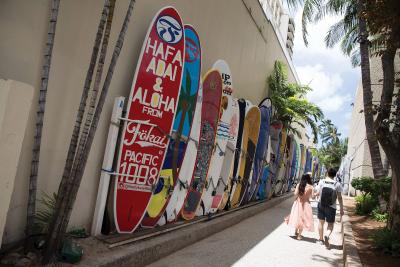 Colorful surfboards of varying sizes are an omnipresent reminder of Hawaiian culture.