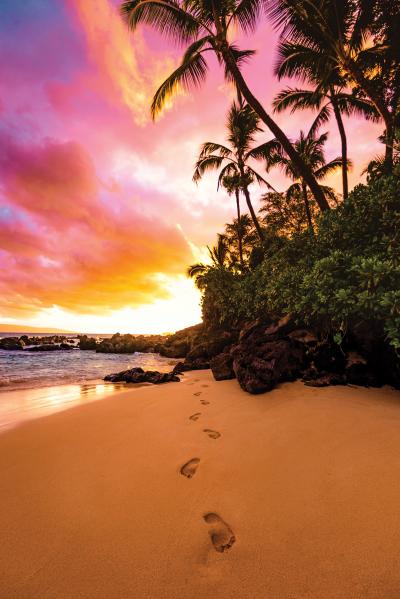 The sun sets on a hidden Hawaiian cove; come June, those footprints in the sand could be yours.