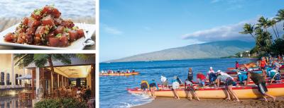 Clockwise from top left: Poke (rhymes with OK), diced and marinated raw seafood, is a staple of native Hawaiian cuisine — though its different incarnations come seasoned with a variety of sometimes spicy-hot ingredients; dabbling paddlers prepare to launch their oceangoing outriggers; diners enjoy an outdoor meal at the café in the courtyard of the Honolulu Museum of Art.