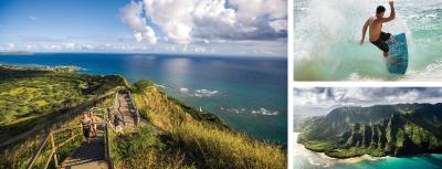 Clockwise from far left: The nearly one-mile trail to the summit of Diamond Head is strenuous and steep, but the stunning panoramic views from the platform at the top of the crater are worth the effort; an intrepid surfer challenges the waves on a boogie board; along with Diamond Head, the lush, corrugated Ko‘olau mountains are one of Oahu’s two National Natural Landmarks.
