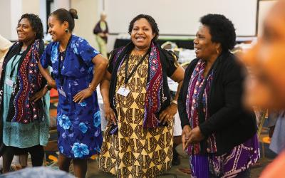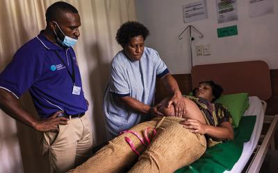 Brown, who has spent her career improving maternal standards from Thailand to Morocco to Afghanistan, crafted the workshop to build connection among the midwives. Each morning, the workshop begins with a song, led by a group of midwives from a different region of Papua New Guinea. When the buddy groups are announced at the end of the first day, the room erupts in cheers as the paired midwives excitedly embrace.