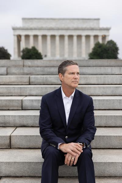Three days after completing his honor ride, Chris Kolenda sits on the steps of the Lincoln Memorial in Washington, D.C.