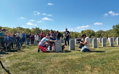 As had been the case weeks earlier at Lowell's grave in Elwood, Illinois — and at the four other stops along Kolenda's journey — a group of about 30 friends and family strains for a glimpse of the arriving colonel's bike, eager to greet him at his final destination.