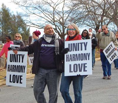 Kiran Singh Sirah, center, marches for peace. Learn why Kiran Singh Sirah believes spinning tales can foster world peace.
