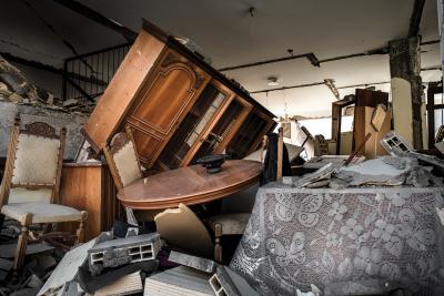 It’s a cool day in March, and the wind blows a shutter open and shut, revealing the plush headboard of a bed inside one of the still-standing buildings. We see a purple ironing board peeking out of an upended roof, a squashed red car, mattresses, bed frames, and bales of hay strewn about.