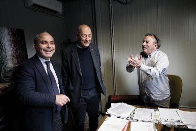 Rotarians Vincent Mazzone and Paolo Raschiatore talk with Aleandro Petrucci (right), Arquata’s mayor, about Rotary’s role in bringing young people back to the village.