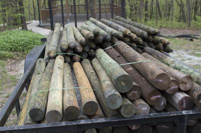 Kinney brings the Gator to a stop beside the stump of a large tree that dropped a limb on a cabin two years ago, thankfully when no children were present. A crew of volunteers led by a Boy Scout director is at work building a replacement.