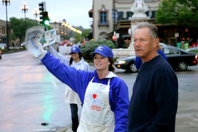 The day of the Royals home opener begins with rallies and special appearances by sports greats like former Royals players George Brett and Frank White. Hundreds of volunteers, including members of 35 Rotary clubs, fan out to street corners across the metropolitan area, selling a special Royals edition of the newspaper and “Raised Royal” fan flags.