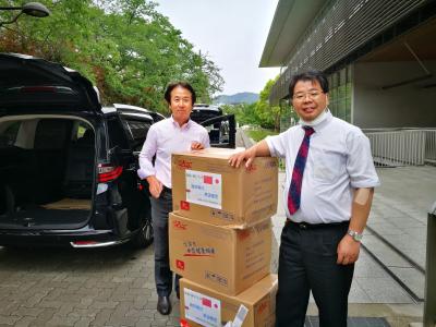 Chen Lin, right, with boxes of masks bound for Kobe University Hospital