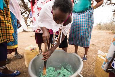 Women in the Soap for Water project demonstrate the soap-making process. Through Maji Masafi’s microfinance program, the women save some of the profits from selling soap and offer small loans in communities without traditional financial services.