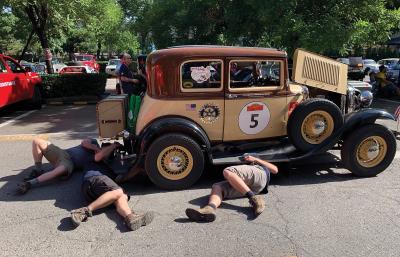 Lee Harman (at right in top left photo) and Bill Ward (at left) consulted with a Ford Model A guru in Texas before buying Miss Vicky. Restoring the car, they got help from a group of fellow gearheads on Camano Island, Washington, including a master mechanic for Model A’s and Model T’s. During the rally, when they weren’t conducting major repairs or scrutinizing the detailed directions, they carried on extended conversations about “politics, air pollution, world population distribution, you name it,” recalls Ward.