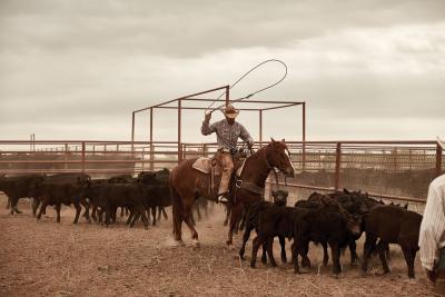A ranch hand uses his lariat to lasso a cow. Cowboy terms with Spanish roots reveal the origins of many Old West traditions.