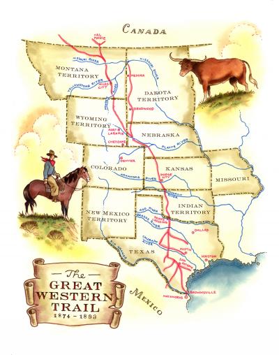 A trip up the Great Western Trail was a hard, dusty, lonely time. The cook would be up first before dawn, making the fire, cooking breakfast, boiling the coffee (sometimes letting the coffee beans soak overnight). The cowboys woke at first light, and when they finished eating, they picked out fresh horses from the remuda and took their positions. Generally, the trail boss was up front, followed (on each side) by the point, swing, flank, and finally drag riders.