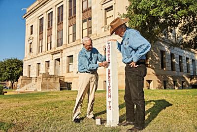 When Mahoney and I arrive, we meet some of the Vernon Rotarians who spent years bringing the trail back to life: Phil McCuistion, who poured the concrete for 121 of the markers with Rick Jouett, and Paul Hawkins, who hand-painted the markers white with red letters. They’re each wearing Great Western Trail shirts, Rotary pins embellished with longhorns, and large belt buckles.