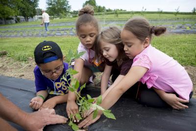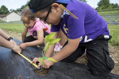 Preschool children from Brown Bear Daycare plant a young tomato plant. The class visits the garden every Monday morning spring to fall.