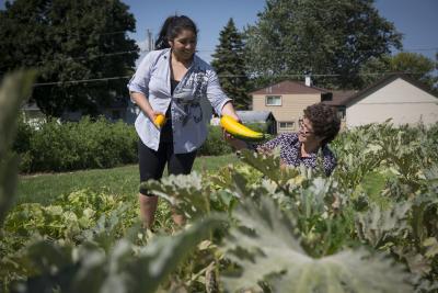 Reina Montes began volunteering at the garden after a back injury forced her to stop working temporarily and she had to go to the pantry to supplement her groceries. When she learned about the garden, she persuaded her daughter, Elizabeth Sanchez, to join her on Mondays to help plant, pick, and weed.