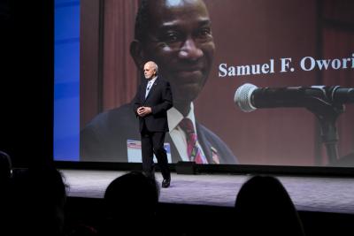 2018-19 RI President Barry Rassin announces his presidential theme, Be the Inspiration, at Rotary's International Assembly.
