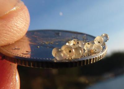 The tiny black dots in these herring eggs, sitting on a dime, are the developing eyes of the fish.