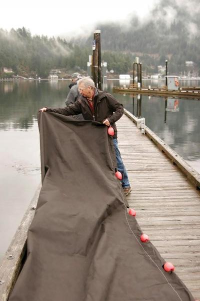 After a Rotary club meeting where the Streamkeepers talked about their success, Pender Harbour Rotarians launched their own project in 2010. Rather than wrapping pilings, the club decided to hang curtains made of landscape fabric alongside docks. The fabric was provided by Fisheries and Oceans Canada, the government department responsible for managing the country’s water resources, and local fishermen donated the floats and lead lines needed to keep the curtains hanging vertically in the water.