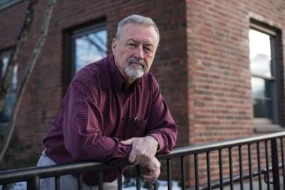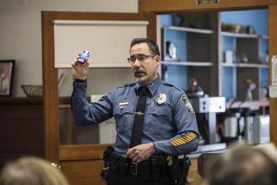 Robert MacKenzie's goal in addressing audiences is to reduce the stigma associated with opioid use. At York County Senior College in Alfred, Maine, he explains the use of naloxone auto-injectors to counter an overdose.