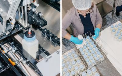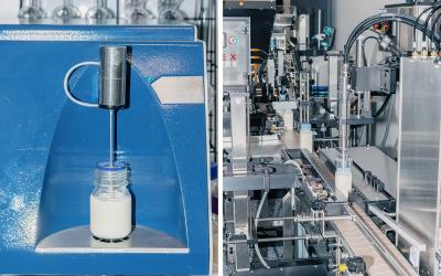 Left: An automated bottling line prepares donor milk for shipment. Right: A lab technician inspects and dries bottles of pasteurized donor milk.