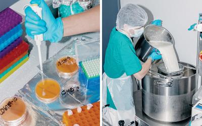 Left: At the Mothers’ Milk Bank of the Western Great Lakes, a small sample of milk from each donor is tested for the presence of harmful bacteria. Right: Milk from multiple donors is pooled to ensure nutritional consistency and a robust antibody profile.