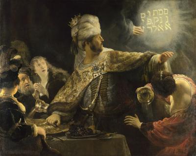 Newsom says there’s speculation that the handwriting on the wall might have literally appeared on walls as graffiti, the joke being that Belshazzar paled in comparison to his predecessor Nebuchadnezzar just as a tekel is smaller than a mene. Ancient graffiti, in this theory, moved from the bathroom wall to an Old Testament story, an amalgamation of the sacred and the profane.