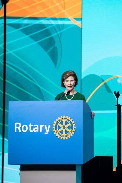 Laura Bush, ex primera dama de los Estados Unidos, agradeció a los rotarios por su compromiso en retribuir a sus comunidades durante la Convención de Rotary en Toronto. Asimismo, resaltó la importancia de la educación para la formación de los niños.