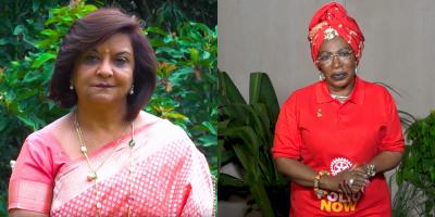 La fiduciaria de la Fundación Rotaria Geeta Manek (izquierda), copresentadora de la Transmisión del Día Mundial contra la Polio. La rotaria Marie-Irene Richmond Aouha (derecha), ex presidenta del Comité de PolioPlus de Costa de Marfil, presenta un segmento del evento.