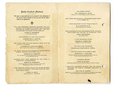 En octubre de 1907, el periódico Chicago Daily Tribune (hoy Chicago Tribune) informó de que el Club Rotario de Chicago había elaborado planos para construir aseos públicos en el céntrico distrito conocido como el «Loop». El club celebró un foro sobre el tema ese mismo mes, señalando que «el tema tiene muchas facetas y puede tratarse de la mejor manera si empezamos reconociendo este hecho y valorando debidamente su importancia». En la reunión intervinieron representantes del club, de la ciudad y de otras organizaciones locales. En la discusión se mencionó la necesidad de que Chicago se mantuviera al día con las últimas prácticas en mejoras municipales y se consideró quién pagaría el proyecto y qué impacto podría tener en las condiciones sanitarias y la salud pública de la ciudad.