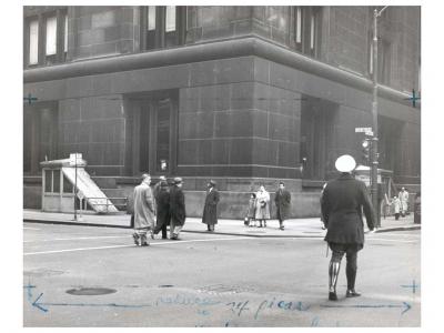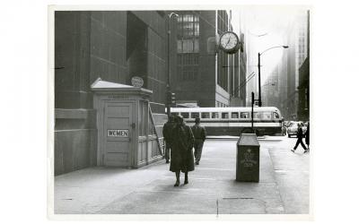 Entradas a los aseos públicos en las calles LaSalle y Washington en Chicago, Illinois (EE. UU.). Antes de febrero de 1955. Estas entradas ya no existen.