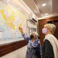 Dr Azra Fazal Pechuho rencontre la présidente du Rotary, Jennifer Jones, au centre d'opérations d'urgence de Karachi en août.