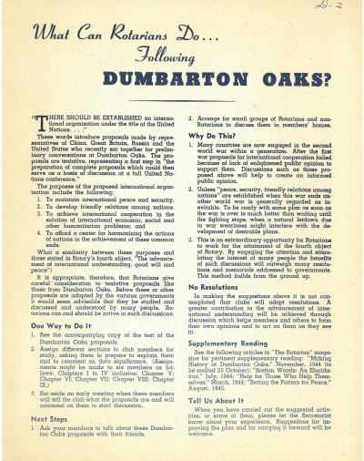 Par la suite, le Rotary publia « What can Rotarians Do Following Dumbarton Oaks? » (Que peuvent faire les Rotariens après Dumbarton Oaks ?) Le document comprenait la proposition de charte, des sujets de discussion, ainsi que des conseils, à l’usage des clubs, pour déterminer en quoi les Nations unies pouvaient aider le Rotary à promouvoir la compréhension internationale. Ce document soulignait également l'importance de planifier l’après-guerre, plutôt que d'attendre la fin des hostilités.