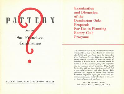 Juste avant que ne débutent les réunions, le Rotary International publia et distribua le pamphlet intitulé « Pattern for the San Francisco Conference » (Suggestions pour la conférence de San Francisco). « C’est une formidable occasion, pour chaque Rotarien, de réaliser notre objectif de service international », proclamait le pamphlet, « en prenant part à ce débat sur un système de gouvernement mondial ».