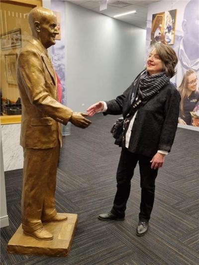 Françoise Durand, présidente sortante de Rotary Mag salue la statue de Paul Harris, fondateur du Rotary, au siège d’Evanston