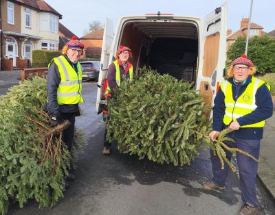 Le Rotary club de Darlington a collecté près de 160 000 euros au cours des 14 dernières années en recyclant des arbres de Noël. En janvier, plus de 70 Rotariens et amis ont collecté 18 000 arbres qui seront broyés et envoyés à un transformateur de biomasse pour produire de l'électricité. Des équipes voyageant dans des camionnettes ont travaillé dans la neige et la glace pendant deux jours pour rassembler les arbres et collecter des dons par ramassage. Le projet est autant une occasion plaisante de se retrouver qu'un service, explique David Hayward, qui dirige la campagne depuis le début. « Tout est prêté gratuitement par des sympathisants locaux, y compris un grand café pour opérer, les grandes camionnettes, un chirurgien arboricole qui réduit tous les arbres en copeaux, ainsi que des centaines de tartes et de pâtés pour que nos bénévoles soient bien nourris, explique-t-il. Le succès dépend du nombre d'arbres, de l'enthousiasme, du dévouement, de l'énergie et du plaisir. » Les fonds récoltés servent à soutenir une maison de repos et d'autres associations locales.