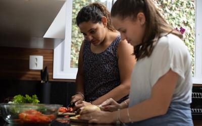 Une jeune fille indienne participant au Youth Exchange du Rotary prépare le déjeuner avec sa sœur hôte au Brésil. 2023.
