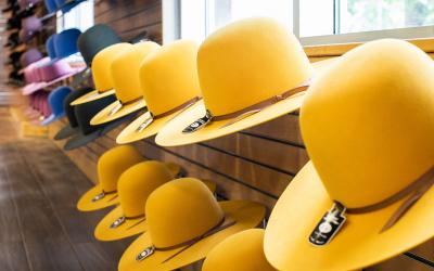Steve McDonough, past presidente del Calgary Stampede, e Wilkinson, socio del Rotary Club di Calgary Stampede Park, si fermano da Smithbilt Hats, dove uno dei cappelli bianchi tipici della città viene cotto a vapore.