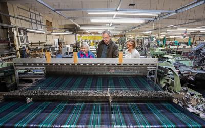 タータン柄の布を製造するLochcarron of Scotland社のシニアオペレーション・マネジャー、アンナ・ヒニガンさんと話すゴードンさん。