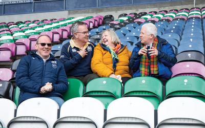 ロータリアンのアンディ・アイルランドさん(左)、友人エリック・ウィリアムソンさんと。エジンバラにあるマレーフィールド・ラグビー・スタジアムにて。