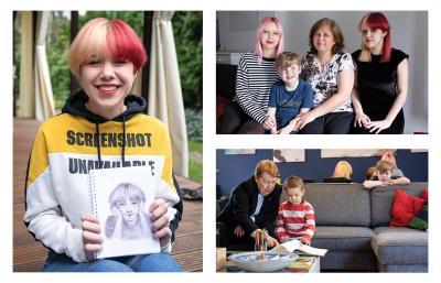 A sinistra: “Sofiia disegna e dipinge. È molto brava", racconta la fotografa dello staff del RI Monika Lozinska. Quando si guarda questa foto, si vede una persona sorridente. Ma quello che c'è dentro può essere una storia completamente diversa. È riservata e tranquilla. Abbiamo parlato in privato verso la fine della giornata. Le ho tenuto la mano e ho visto sul suo braccio ciò che mi ha detto essere l'impronta di un trauma passato. Sembrava triste. Le manca molto la sua migliore amica. Tutti sono separati e non sai se li rivedrai mai". In alto a destra: Olena Morhun con le figlie Alisa (a sinistra) e Sofiia e il figlio Vitalii. "Anche se è una situazione difficile per Alisa, che frequenta l'Università, è più facile per lei rimanere in contatto con le persone, continuare a studiare, avere un po' di normalità", dice Widlicki. "Mentre Sofiia è molto sensibile. È un'anima artistica". In basso a destra: Vitalii Morhun osserva e Tymur Shakirov legge un libro con Krystyna Wilczyńska-Ciemięga, la Rotariana polacca che ha aperto la sua casa a due famiglie di profughi dall'Ucraina. "Le due ragazze hanno giocato insieme in modo molto naturale", ha dichiarato Kim Widlicki, specialista di marketing e social media presso la sede di Zurigo, che faceva parte della squadra di tre intervistatori del Rotary. "Ci è sembrato che i ragazzi si conoscessero da anni. C'era un bel legame tra di loro, così come tra tutte le famiglie".